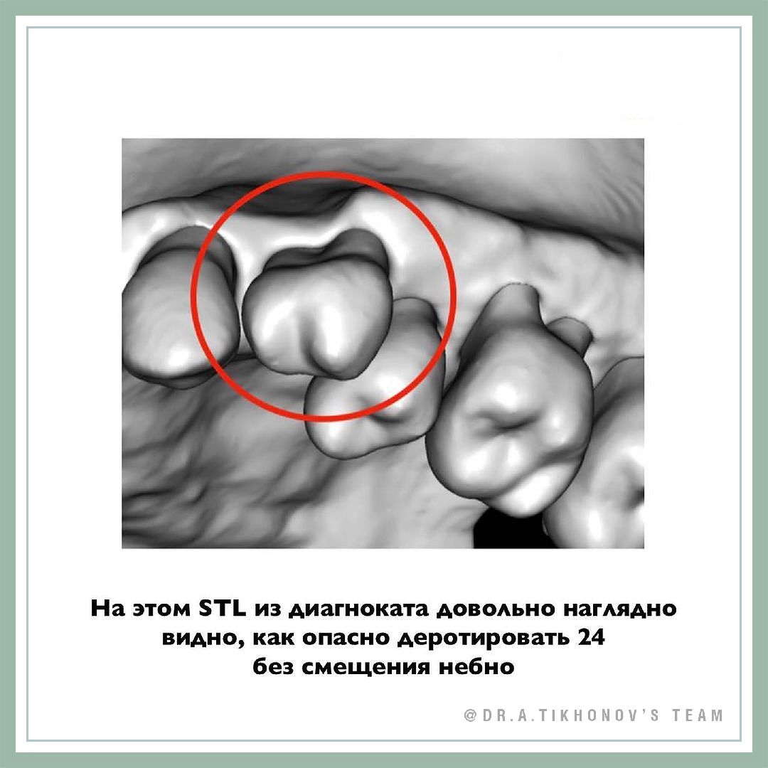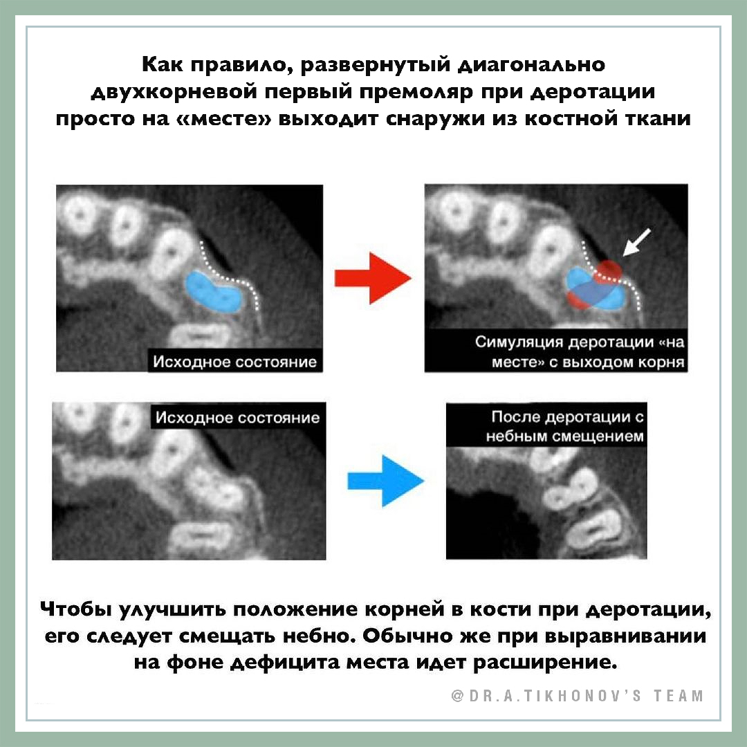 Развернутый диагонально премоляр с двумя корнями довольно опасно деротировать просто так, «на месте». Обычно, если его развернуть в правильное положение, то корень занимает значимо больше места вестибулоорально и просто не помещается в альвеолярном отростке. В итоге - частичный выход корня из кости и рецессия.