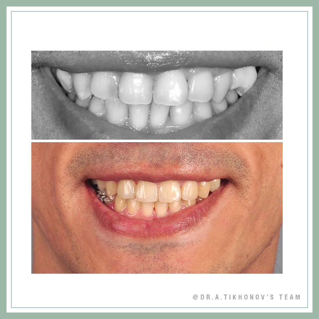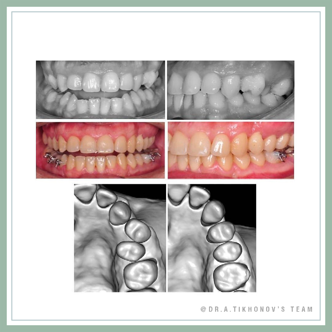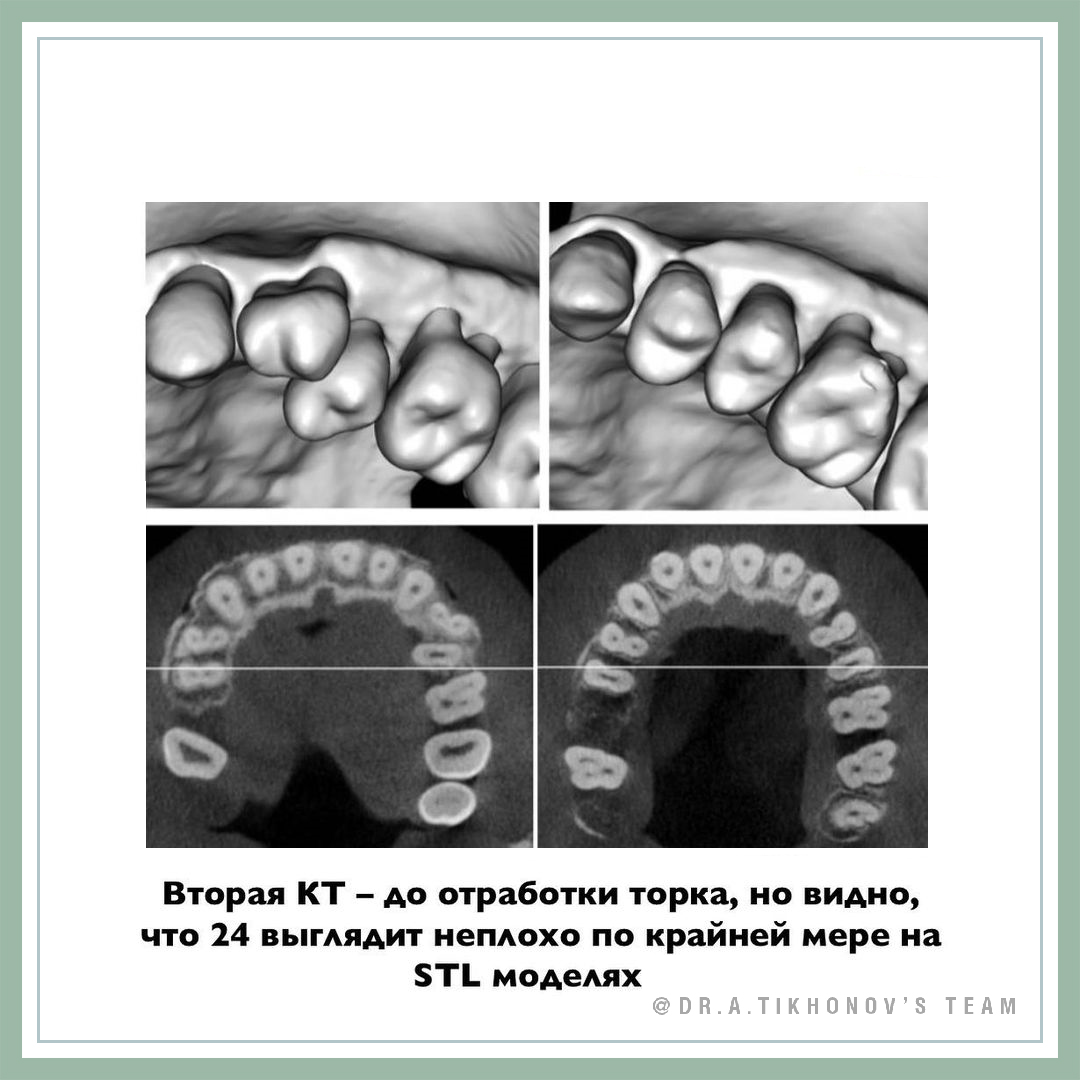 В карусели есть КТ после реализации этих двух описанных механик, но еще до отработки торка на ТМА и стали. Но даже на нем уже все вполне прилично, корень не вышел из кости. Потом была отработка торка дополнительно уже на дугах (брекет 24 вверх ногами - торк +11). На фото «после» можно видеть, что деротация прошла без ухудшения рецессии десны.