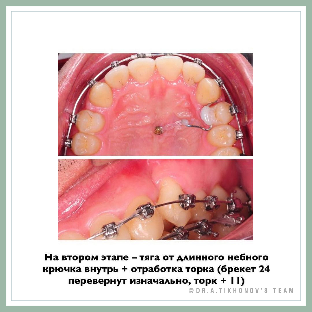 В любом случае, тяга была значимо выше уровня коронки, что помогало больше убрать зуб внутрь корпусно, а не наклоном коронки. Ведь нам надо было думать о корне.