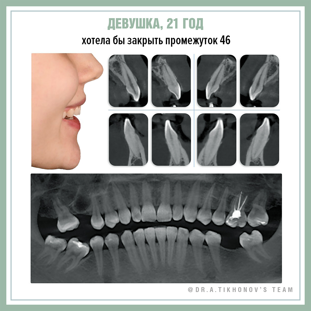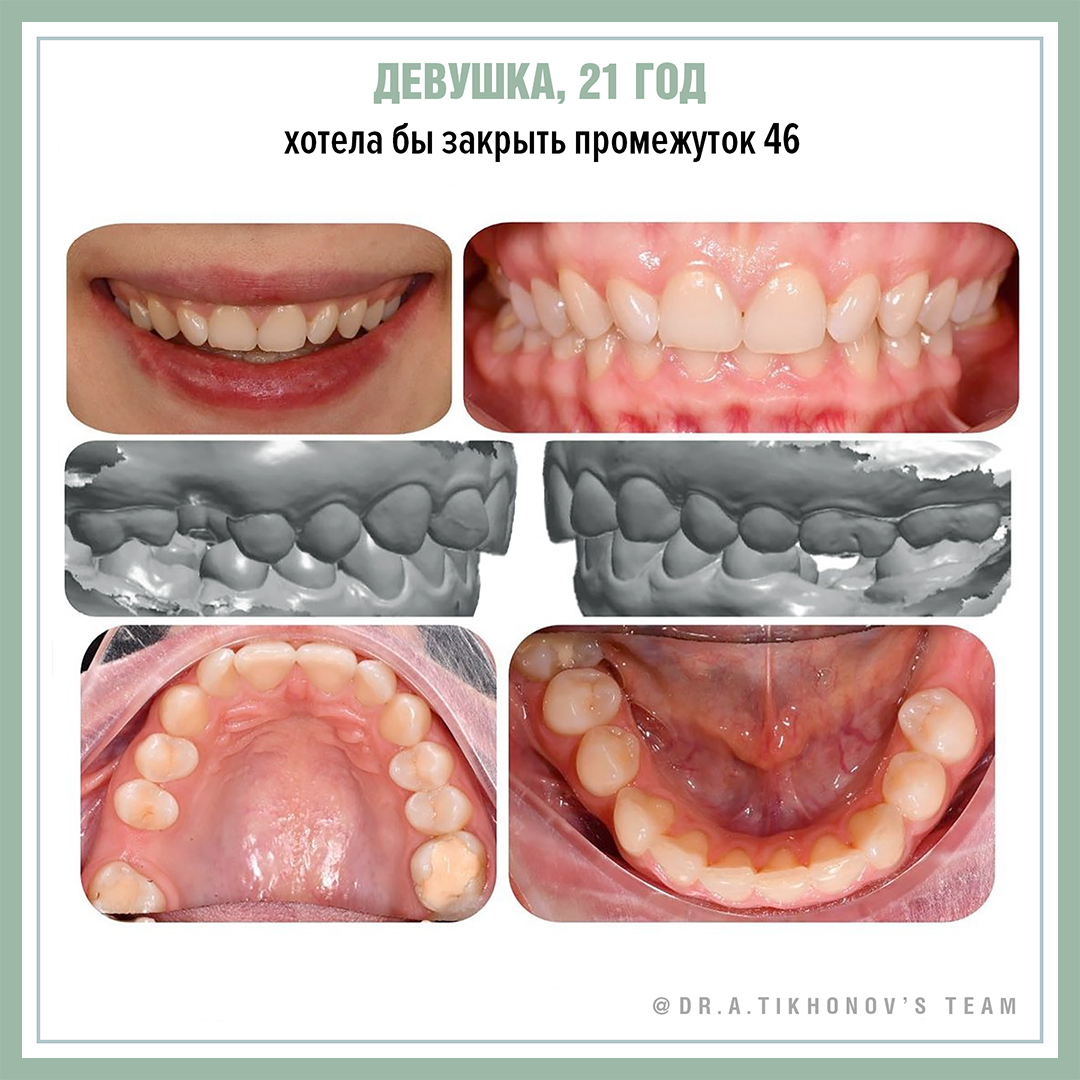 Пациентка хочет закрыть промежуток от 46. На наш взгляд, если так и делать, то нужно идти не совсем стандартно, сохраняя справа 2 класс. Подробнее – смотрите иллюстрации.