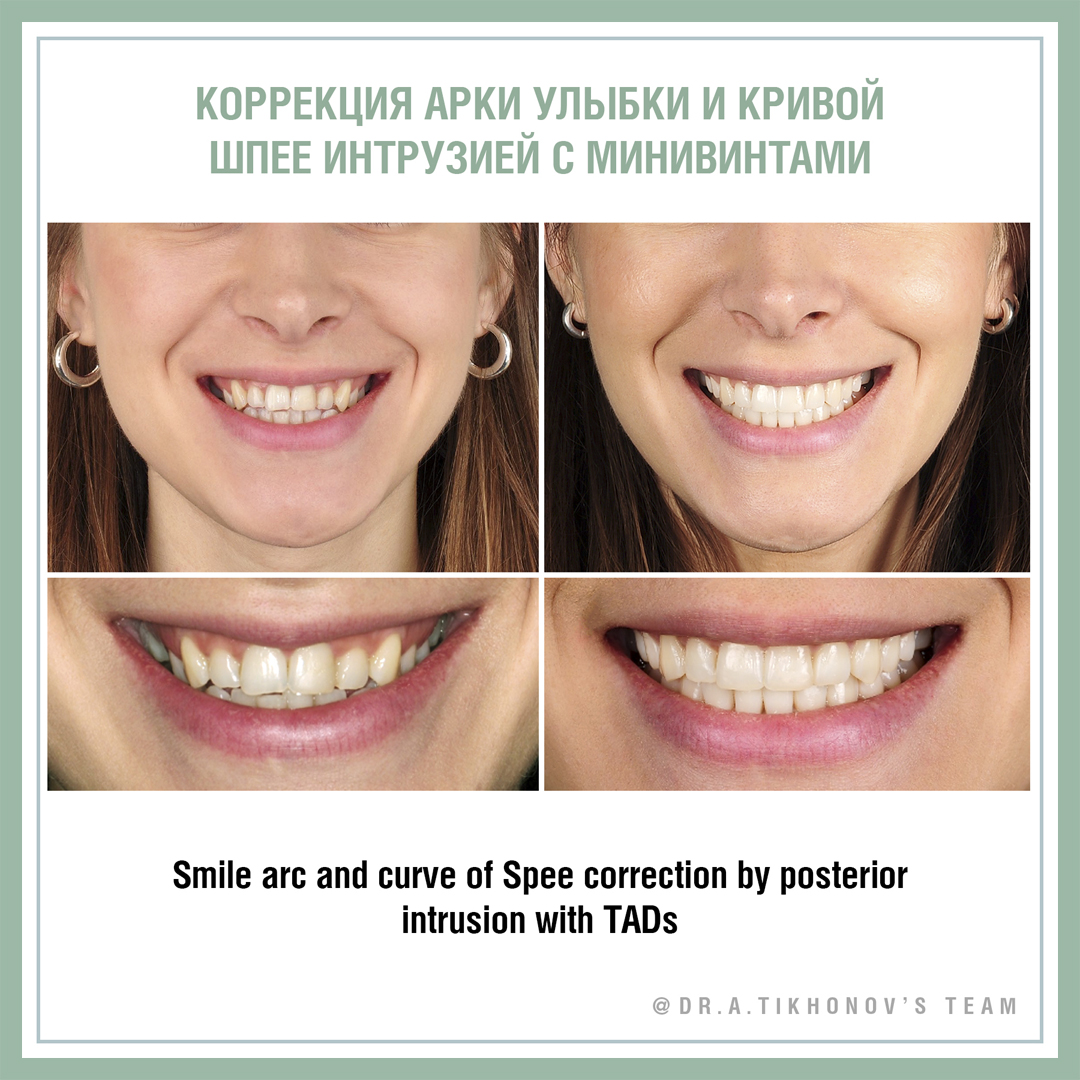 В современных реалиях, с наличием опыта и ортодонтических минивинтов, мы, конечно, решаем и параллельные задачи, старясь максимально улучшить эстетику улыбки наших пациентов. Минивинты применялись для внедрения 4, 5, 6 и выравнивания таким образом кривой Шпее.
