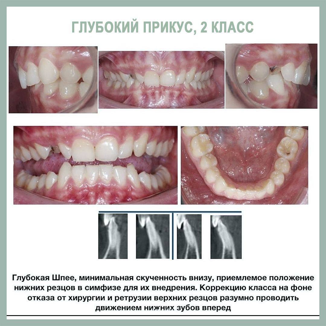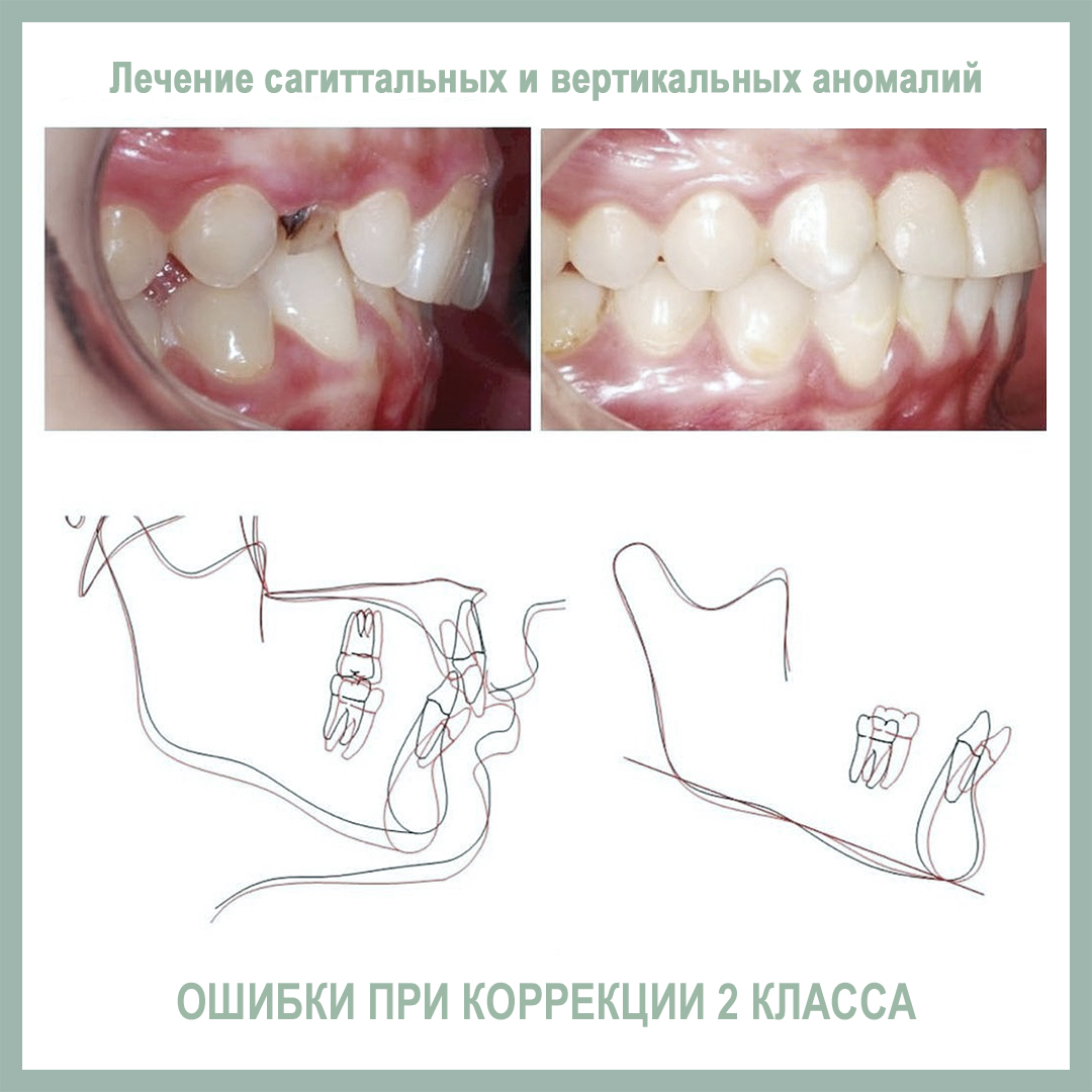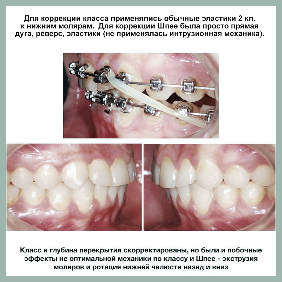 Передние короткие эластики 2 класса (2-5) не экструзировали бы нижние моляры, но применять их тут тоже плохо. Они бы вызвали ротацию верхнего ряда с экструзией верхних резцов, что плохо на фоне их ретрузии и экструзии уже до лечения глубокого перекрытия.