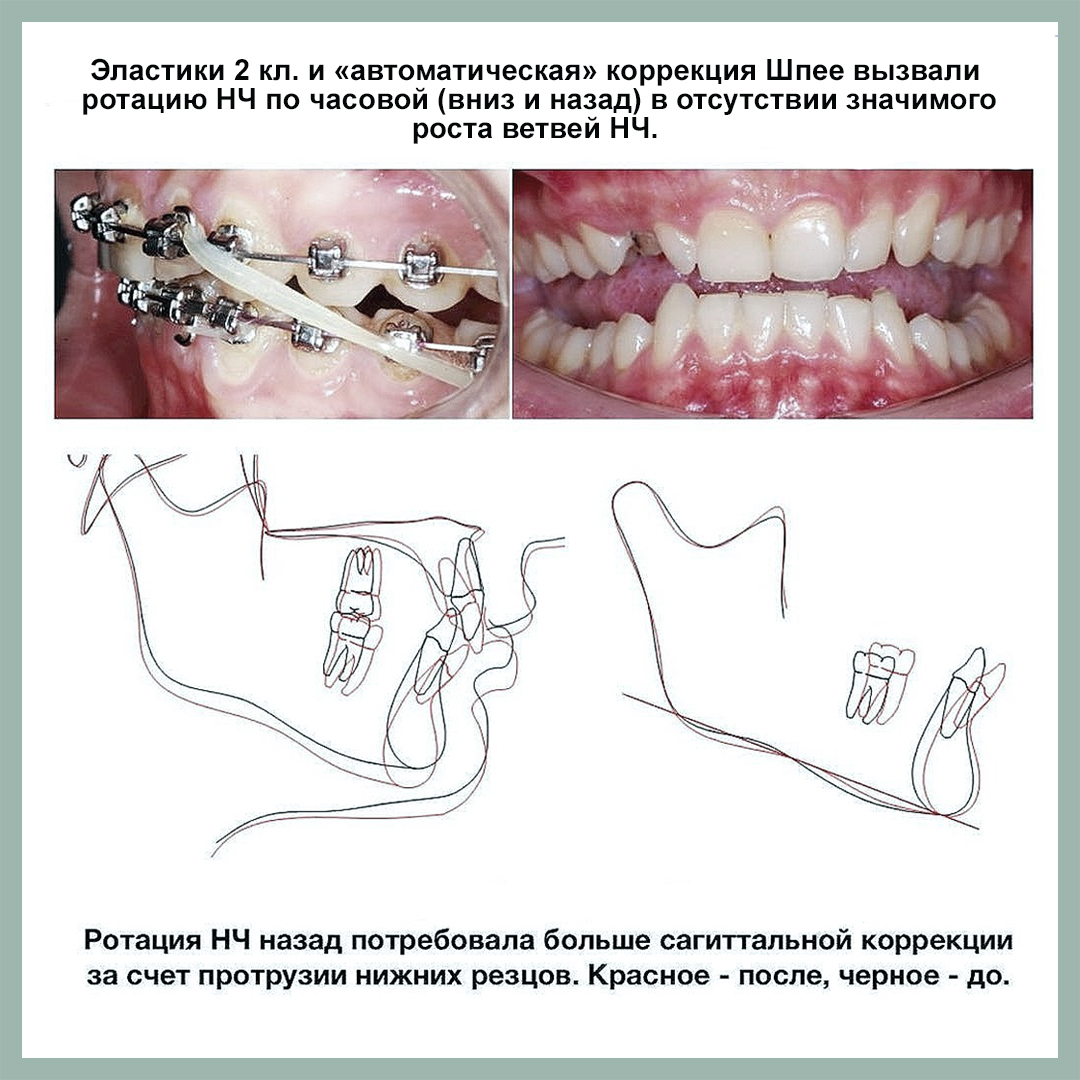Можно было бы противостоять этой экструзии накусочными брекетами впереди, но тогда это усилило бы коррекцию Шпее за счет экструзии боковых зубов, что привело опять же к ротации челюсти вниз и назад.