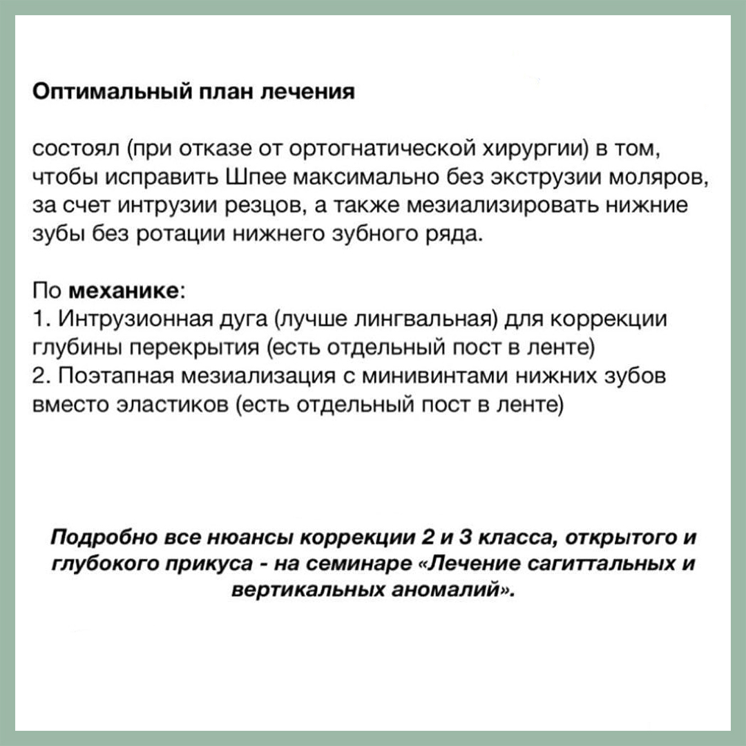 Сегодня бы применил интрузионную дугу, лучше лингвальную, для коррекции Шпее, а класс корректировал бы двигая нижние зубы вперед по протоколу поэтапной мезиализации с минивинтами. Тогда протрузия резцов внизу была бы на 2-3 мм ниже. Кто-то скажет, что это все - мелочи. Но из них состоит качество лечения, а это уже не мелочь!