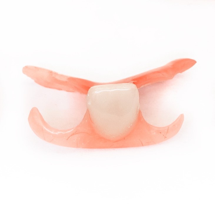 Это конструкция съемного типа, которая имеет крепления для фиксации на здоровых зубах, расположенных по обе стороны от дефекта. Изготавливается”бабочка” из полимерных материалов – обычно нейлона или акрила.