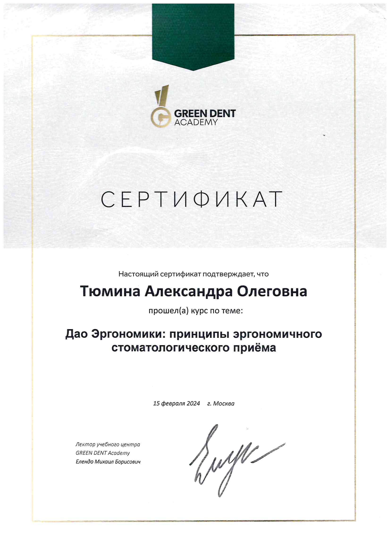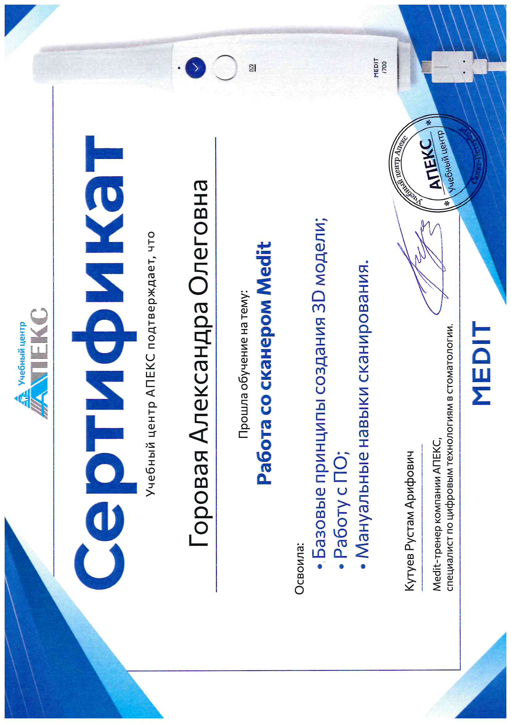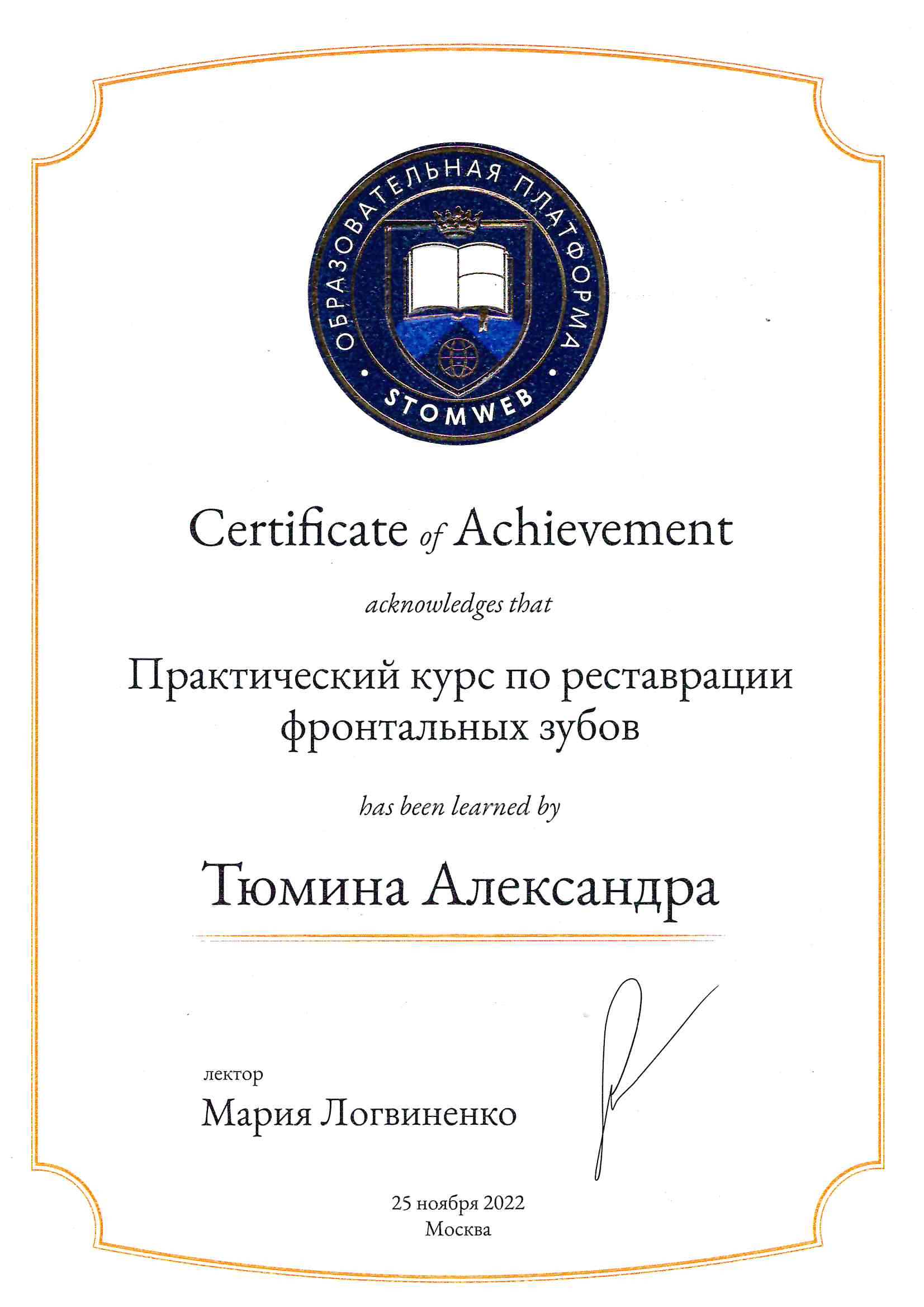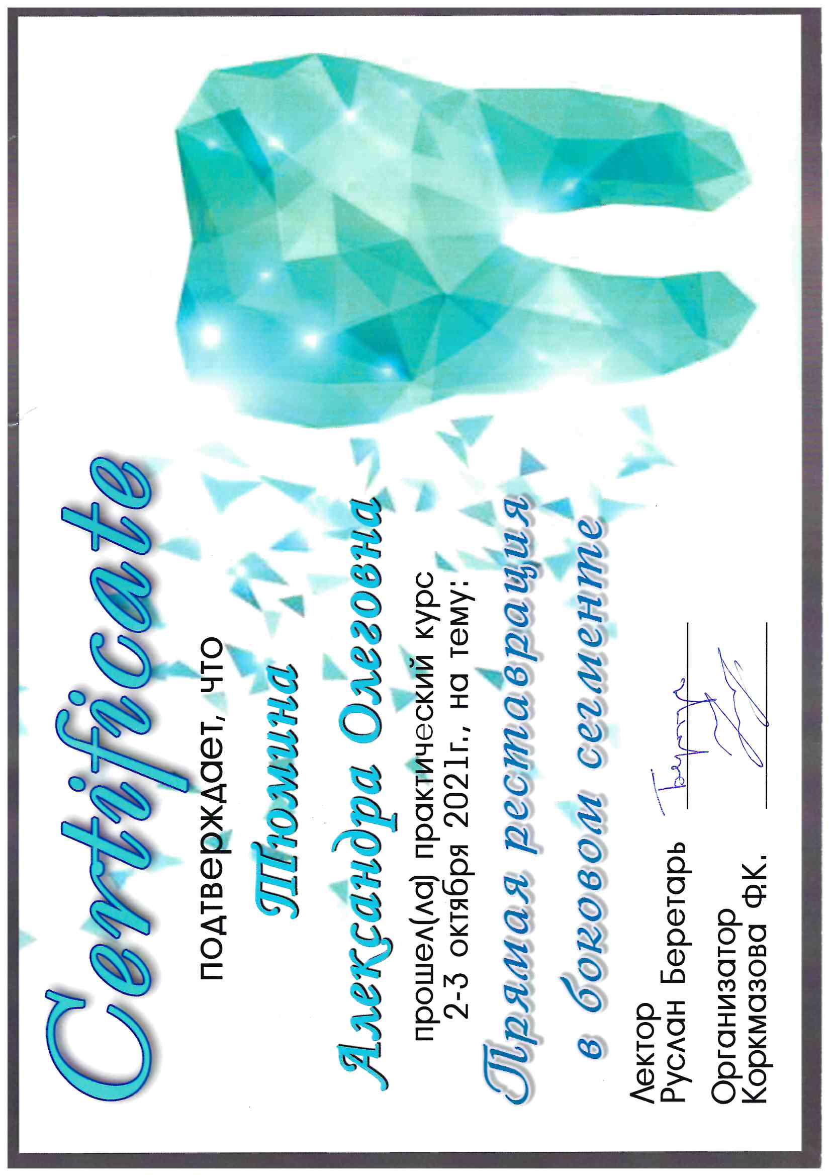 Частное учреждение «Образовательная организация дополнительного профессионального образования «Международная академия экспертизы и оценки». г. Саратов. Сертификат специалиста № 1164242146691, регистрационный № 0051 от 31.12.2019 по специальности стоматология терапевтическая