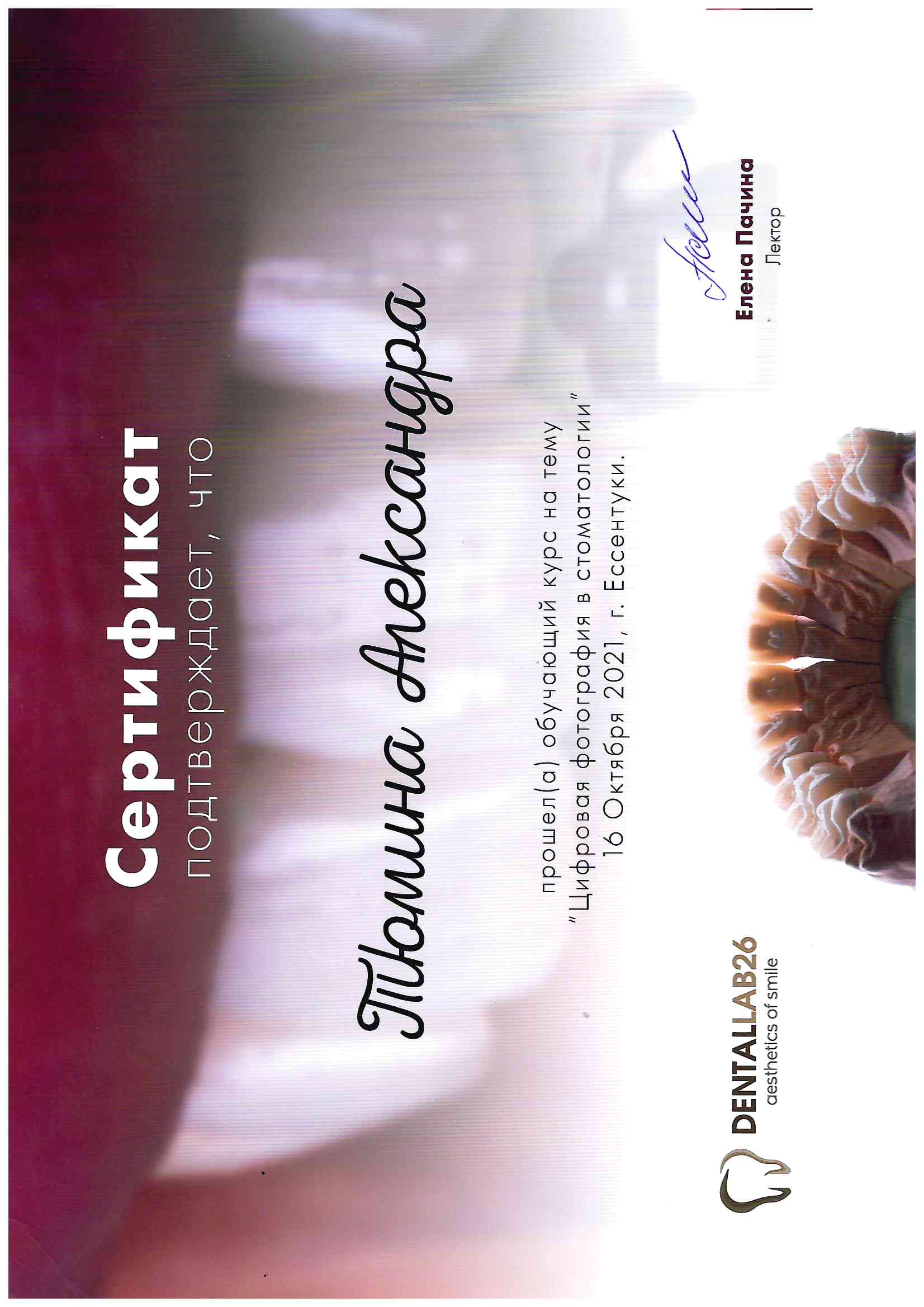 Частное учреждение «Образовательная организация дополнительного профессионального образования «Международная академия экспертизы и оценки». г. Саратов. Удостоверение о повышении квалификации №642409802719, регистрационный № 4839 от 31.12.2019г. по программе «стоматология терапевтическая»