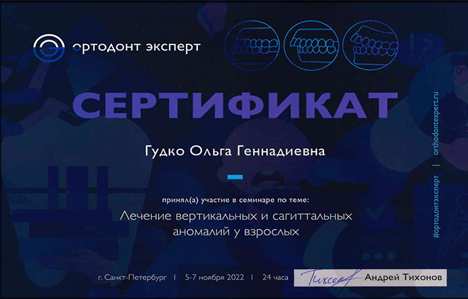 ФГБОУ ВО «Волгоградский государственный медицинский университет» МЗ РФ. Свидетельство об аккредитации специалиста №332400029347, регистрационный номер 18С-051. Первичная аккредитация специалиста от 12.07.2018г. по специальности стоматология общей практики (профессиональный стандарт - 02.005 Врач-стоматолог)