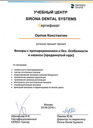 Санкт-Петербургский Институт Стоматологии. Диплом о профессиональной переподготовке Серия ПП-I № 476374, регистрационный № ПО-104 от 18.12.2008г по программе стоматология ортопедическая.