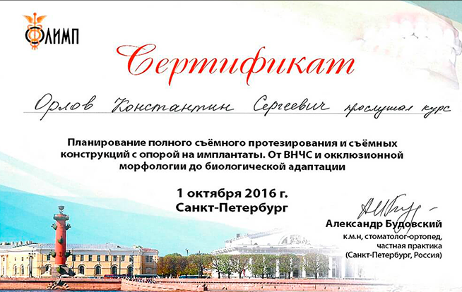 Частное образовательное учреждение дополнительного профессионального образования «Санкт-Петербургский институт стоматологии последипломного образования». Удостоверение о повышении квалификации, регистрационный № КХ-548 от 22.06.2017г. по программе стоматология хирургическая.