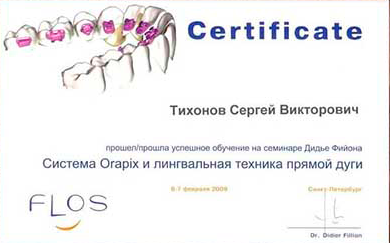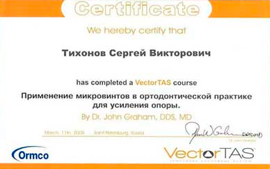 Государственное бюджетное образовательное учреждение высшего профессионального образования «Северо-западный государственный медицинский университет имени И.И. Мечникова» Министерства здравоохранения Российской Федерации. Сертификат специалиста № 0178240022759 от 31.10.2018г. по специальности ортодонтия