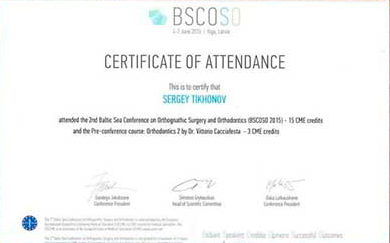 Государственное бюджетное образовательное учреждение высшего профессионального образования «Северо-западный государственный медицинский университет имени И.И. Мечникова» Министерства здравоохранения Российской Федерации. Удостоверение о повышении квалификации № 017804 0022665 от 31.10.2018г. по циклу «Самолигирующие брекеты. Показания, особенности применения пассивных систем»